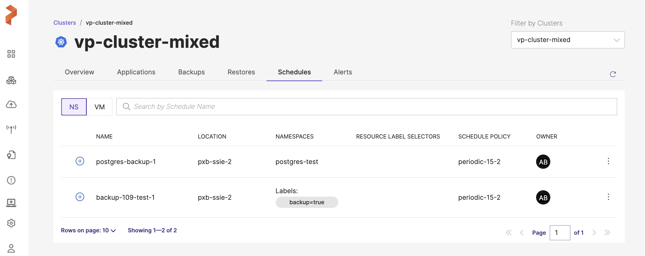 - NAMESPACES: lists the namespace where the backup (tied to the schedule) resides