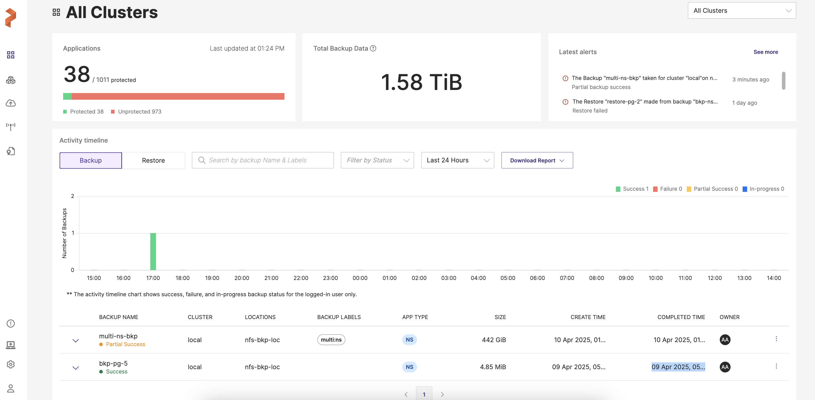 Backup: this tab displays the details of all the backups of various applications you have created across multiple clusters and single cluster
