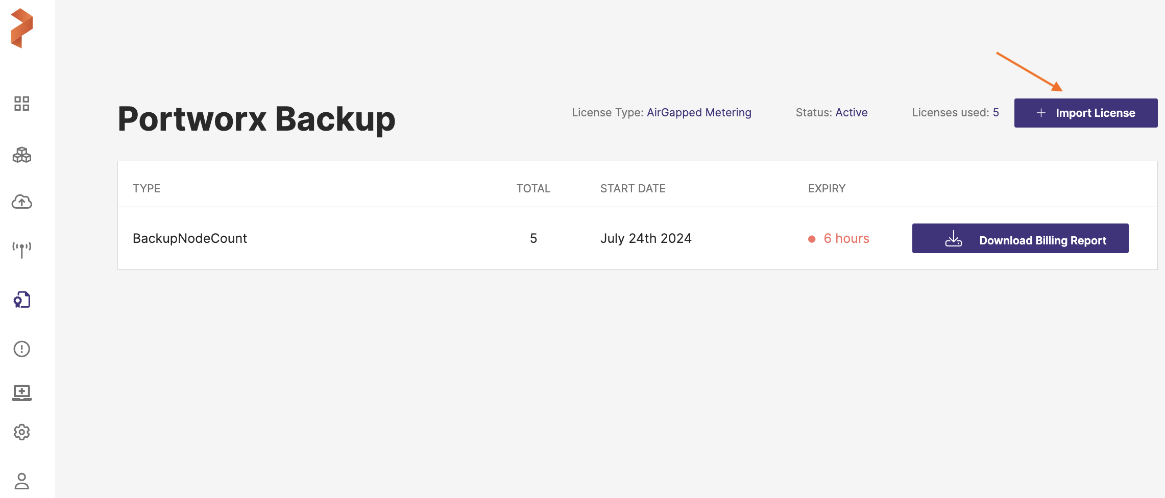 Portworx Backup allows its users on air-gapped cluster environments to opt for usage-based licenses so that they pay only for the backup nodes that are in use and for the number of node-hours they utilize. Users can activate usage-based licensing by activating air-gapped metering license. Also, for such environments, Portworx Backup web console provides an option to download a billing report. The users should share the report with the Portworx Support/CSM team for billing purposes.