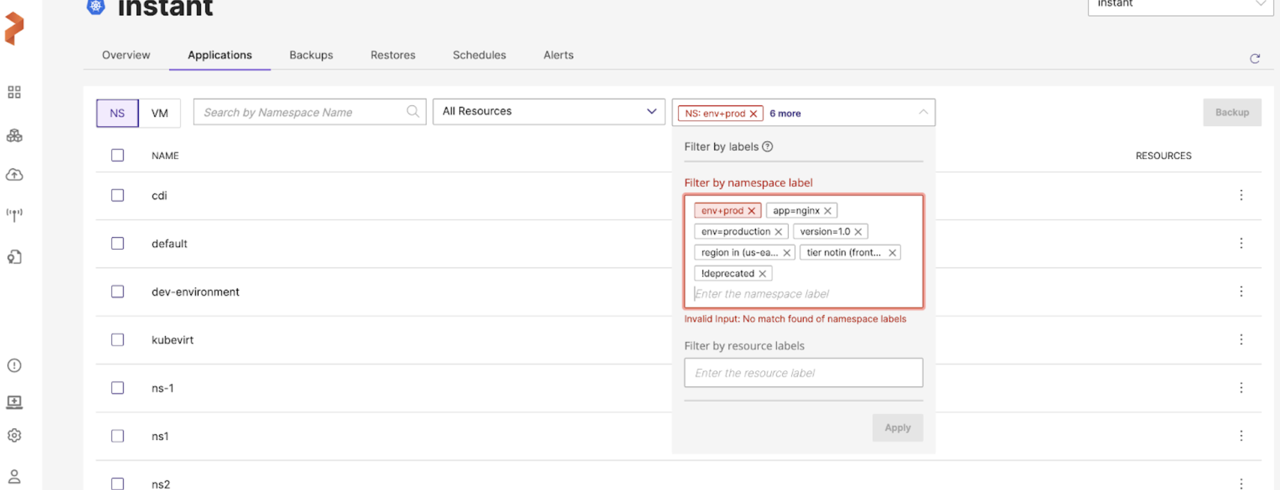 Back up namespaces by labels