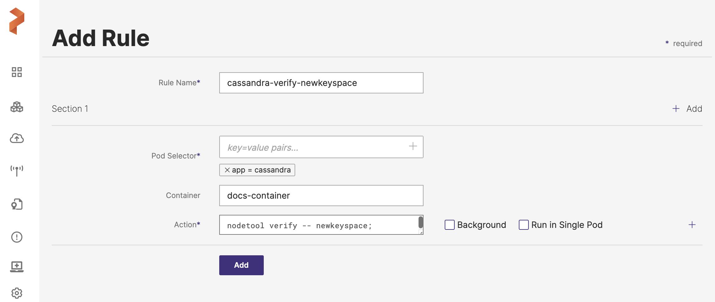 A post-exec backup rule for Cassandra is not important as the pre-exec backup rules mentioned above. However, for completeness in production and to verify a keyspace is not corrupt after the backup occurs, create a rule that runs nodetool verify. The verify command validates (check data checksums for) one or more tables.