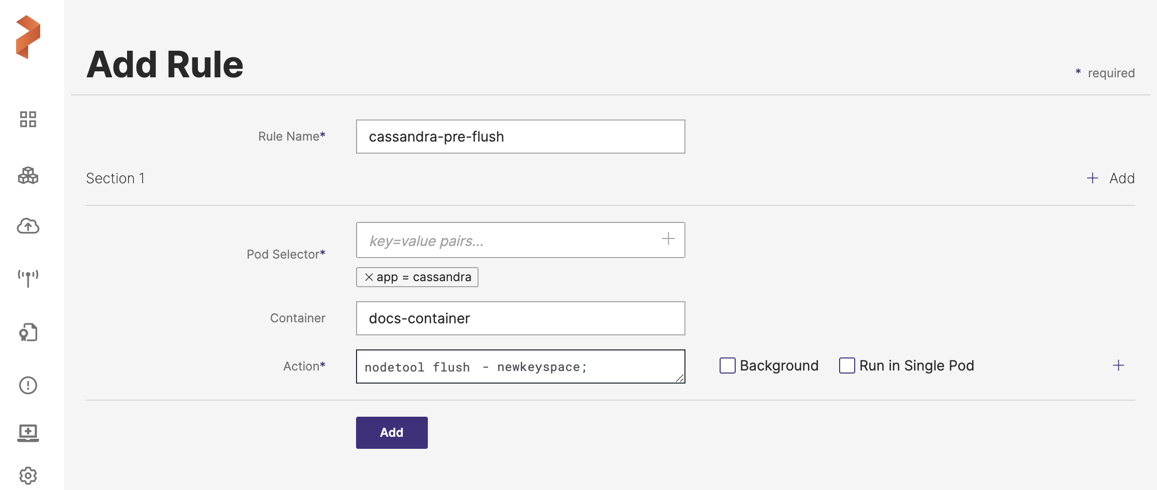 Portworx Backup allows you to set up pre and post backup rules that are applied before and or after a backup occurs. For Cassandra, you can create a custom flush, compaction, or verify rule to ensure a healthy and consistent dataset before and after a backup occurs. Rules can run on one or all pods associated with Cassandra, which is a requirement for nodetool commands.