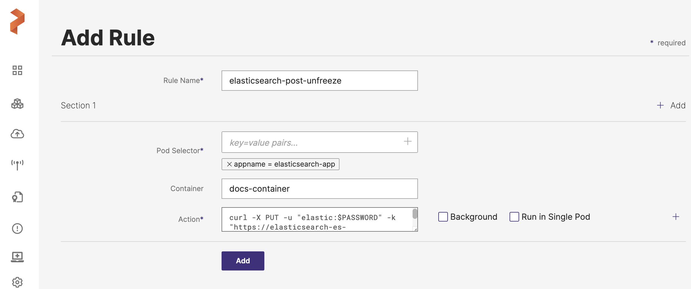 If your Elasticsearch version is 7.8 and above, pre-exec or post-exec rules are not required to create a backup of your application data. You can simply back up your data without associating any exec rules.