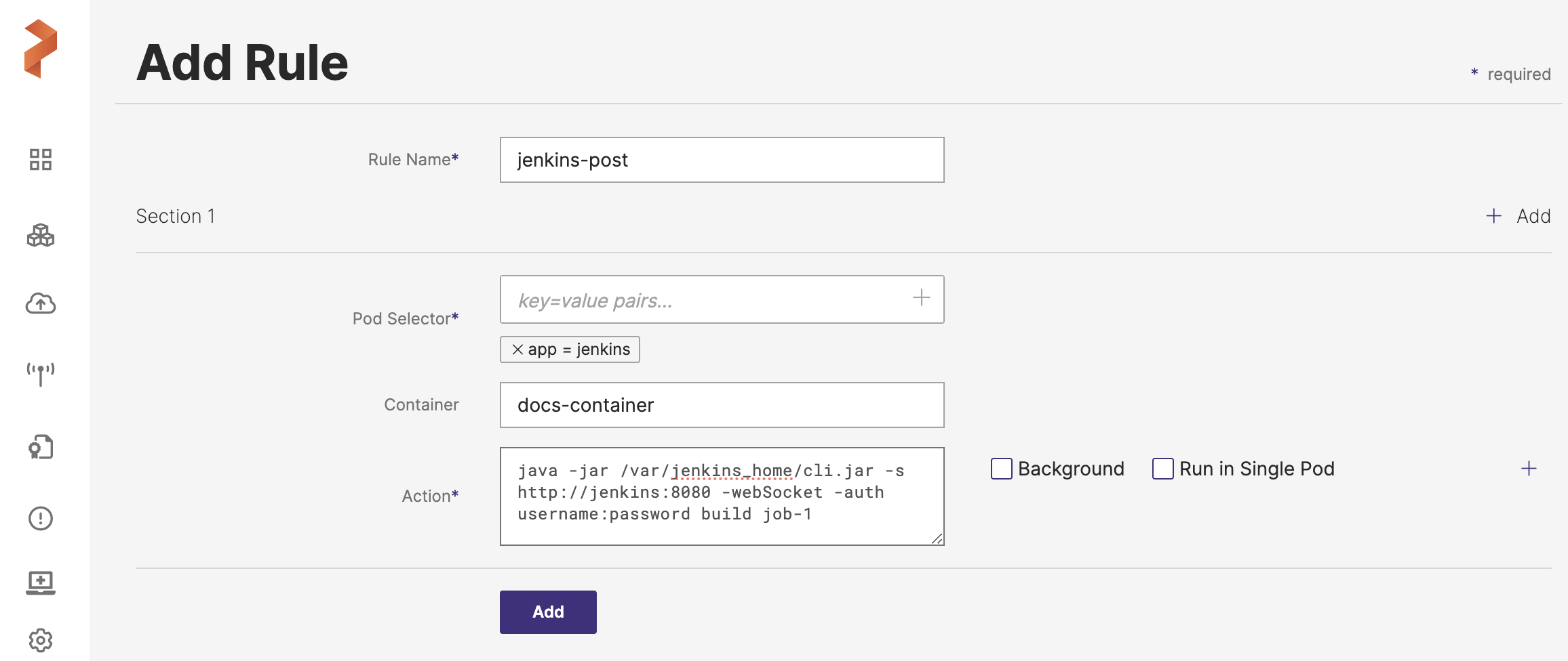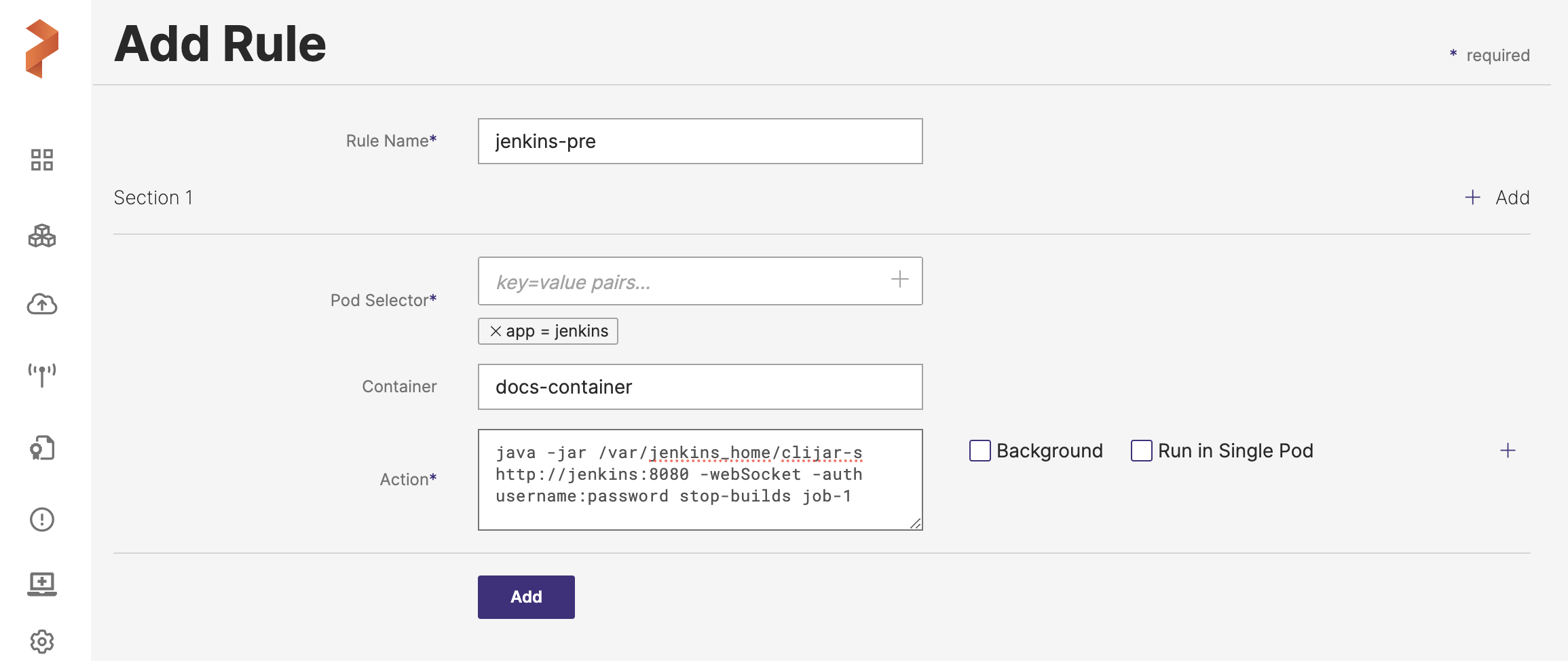 Assume the Jenkins deployment has a job called job-1, you will use the pre-exec rule to make sure this job is stopped before taking our snapshot.