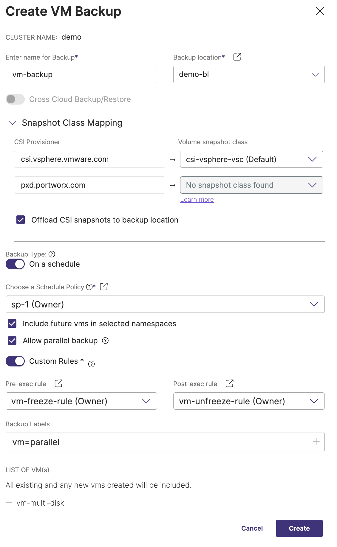 Cross-cloud Backup/Restore: this toggle button is disabled by default for VM backups, because Portworx Backup currently does not support cross-cloud (with KDMP driver) backups and restores for VM-based backups.