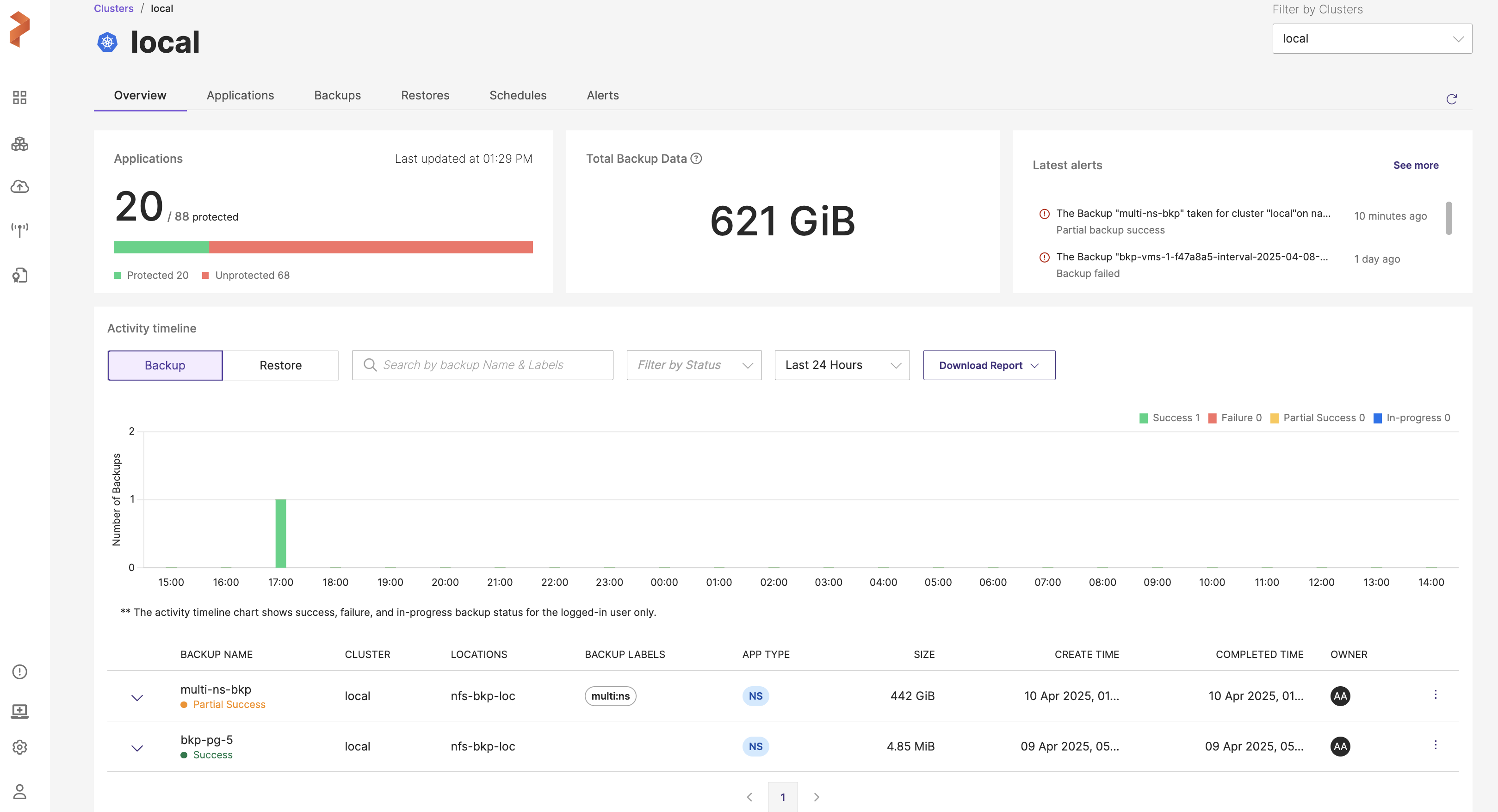 You can view the namespace backup you have created in the Clusters > Backups tab of your application cluster.