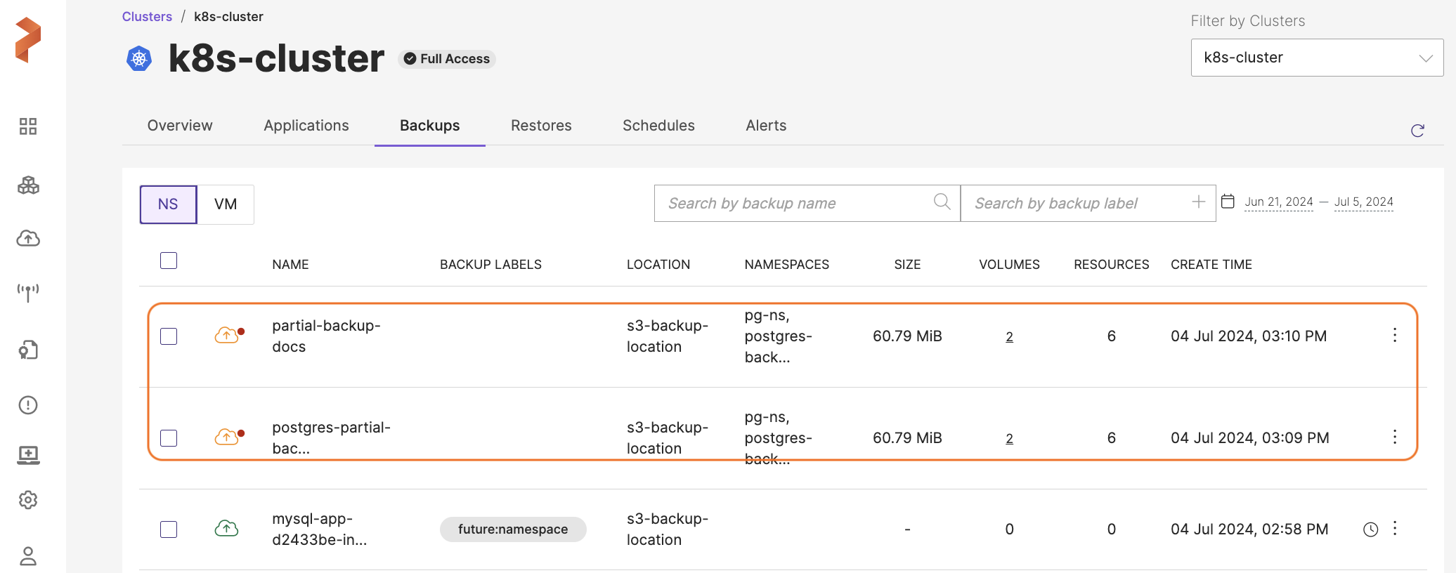 notePortworx Backup allows you to select multiple namespaces of a cluster from different pages and then back up the selected namespaces in a single click.