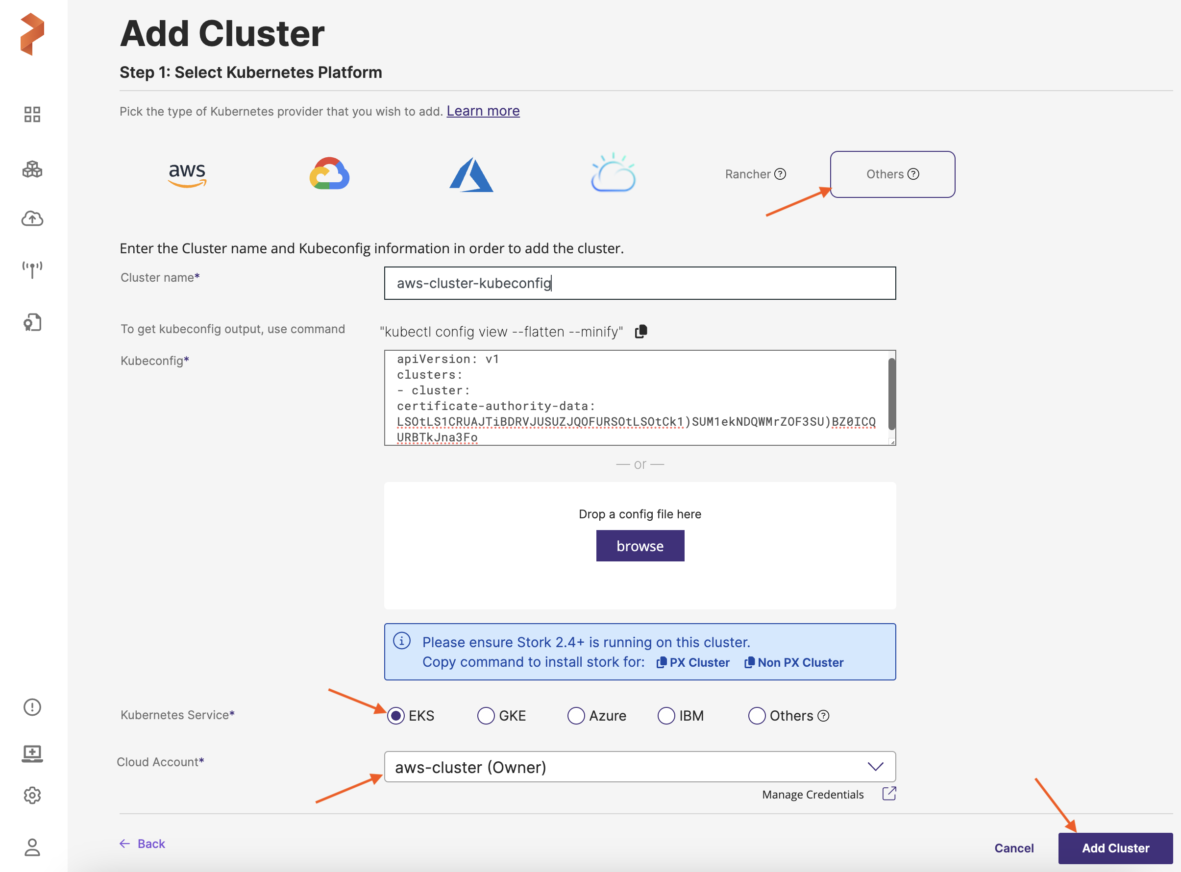 Kubeconfig: retrieve the Kubeconfig from your cluster and paste it in this field or click Browse to upload the config from a file
