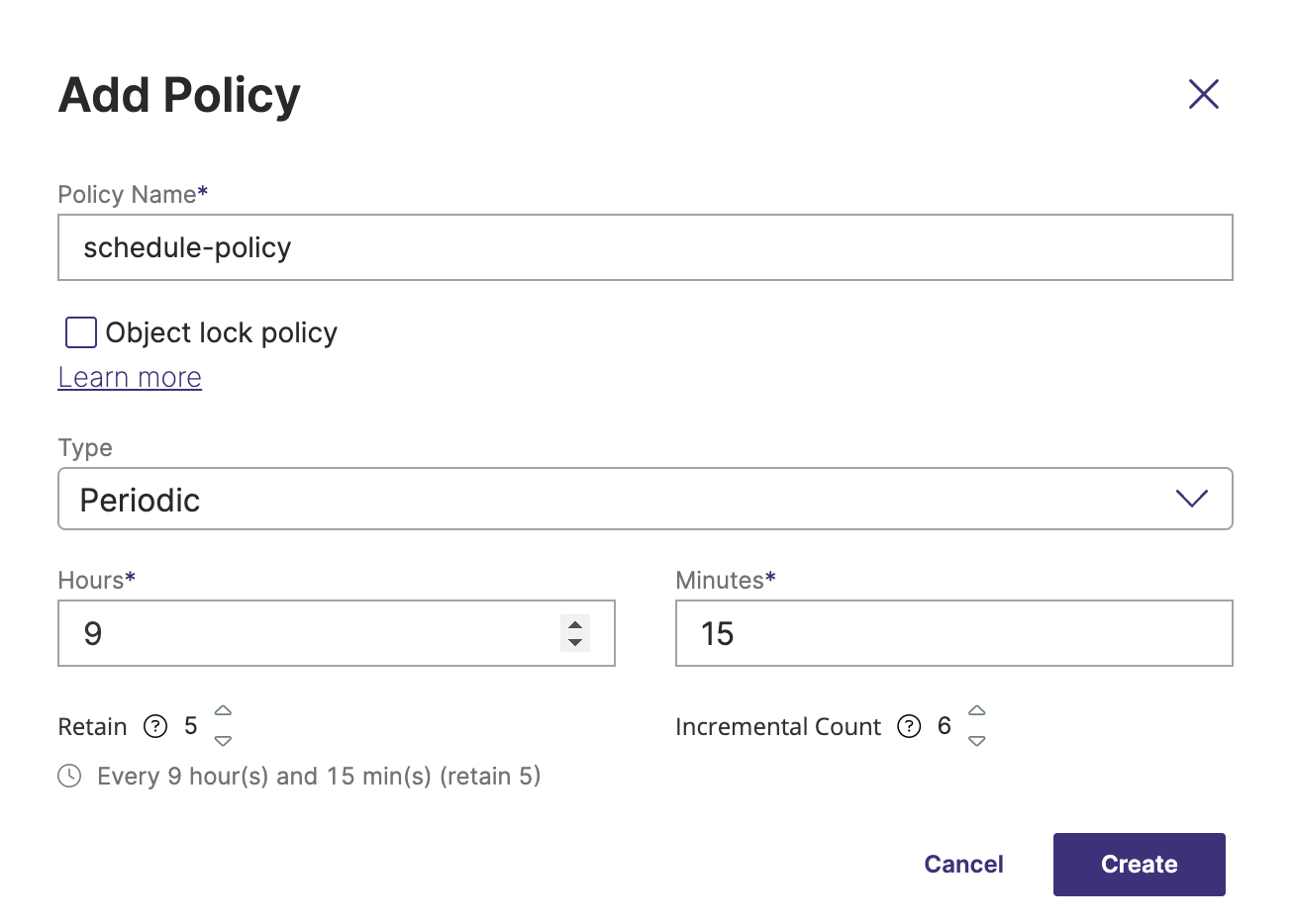 Object Lock Policy: do not select this option to create an unlocked schedule policy for your backup.