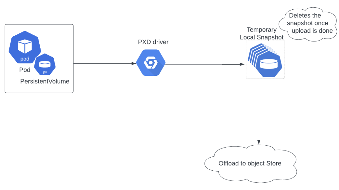 Portworx uses this metadata to calculate the difference between snapshots for upload and does not need to store previous snapshots for comparison. As Portworx reduces the footprint of the locally stored cloud snapshot data significantly. However, Portworx must also upload this metadata to the cloud alongside the cloud snap data, resulting in slightly larger uploads.