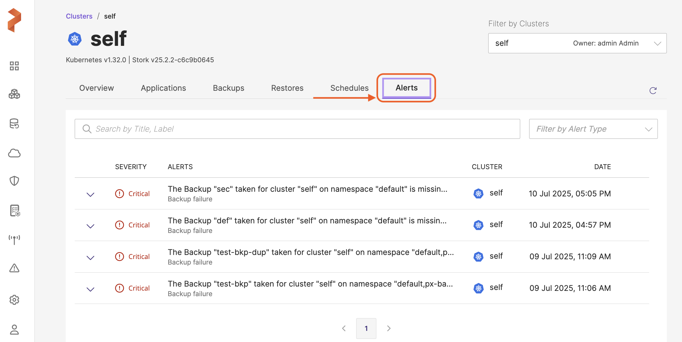 To access Alerts, click Alerts icon in the left navigation pane of Portworx Backup home page. Alerts page contains two tabs: