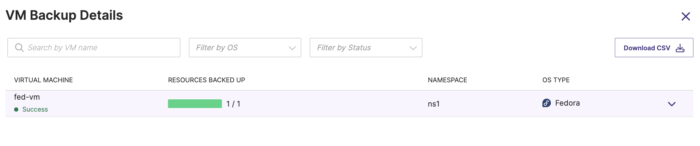 For VM backups, the Show Details option displays granular details of the VMs, the associated PVCs, resources and the namespaces linked with the VMs as shown below. For large resource backups, Show Details window displays only the PVCs associated with the VMs but not the resources.