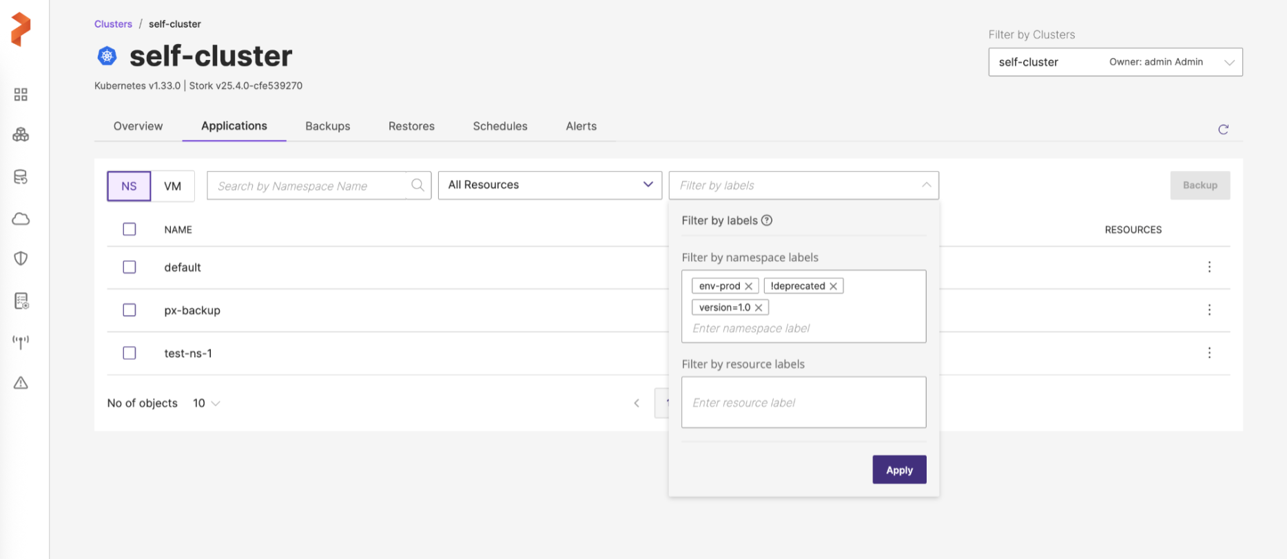 Portworx Backup now provides advanced filtering namespaces to be included or excluded to the backup operation to support more flexible selection of namespaces. This feature allows users to narrow-down or refine the number of namespaces for the backup operation from a huge list. It helps users tailor backup jobs more precisely by quickly selecting the subsets of namespaces with the combination of namespace and resource labels.