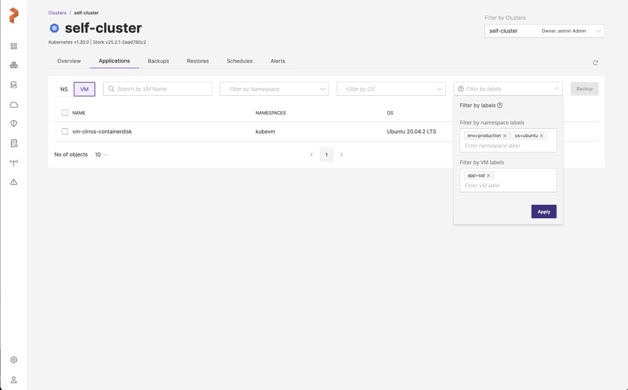 Portworx Backup now supports more flexible backup selection by allowing users to include or exclude VMs and their resources based on the labels. This feature applies to both manual and scheduled backups and helps users to quickly pick the required VMs and their resources for the backup operation.