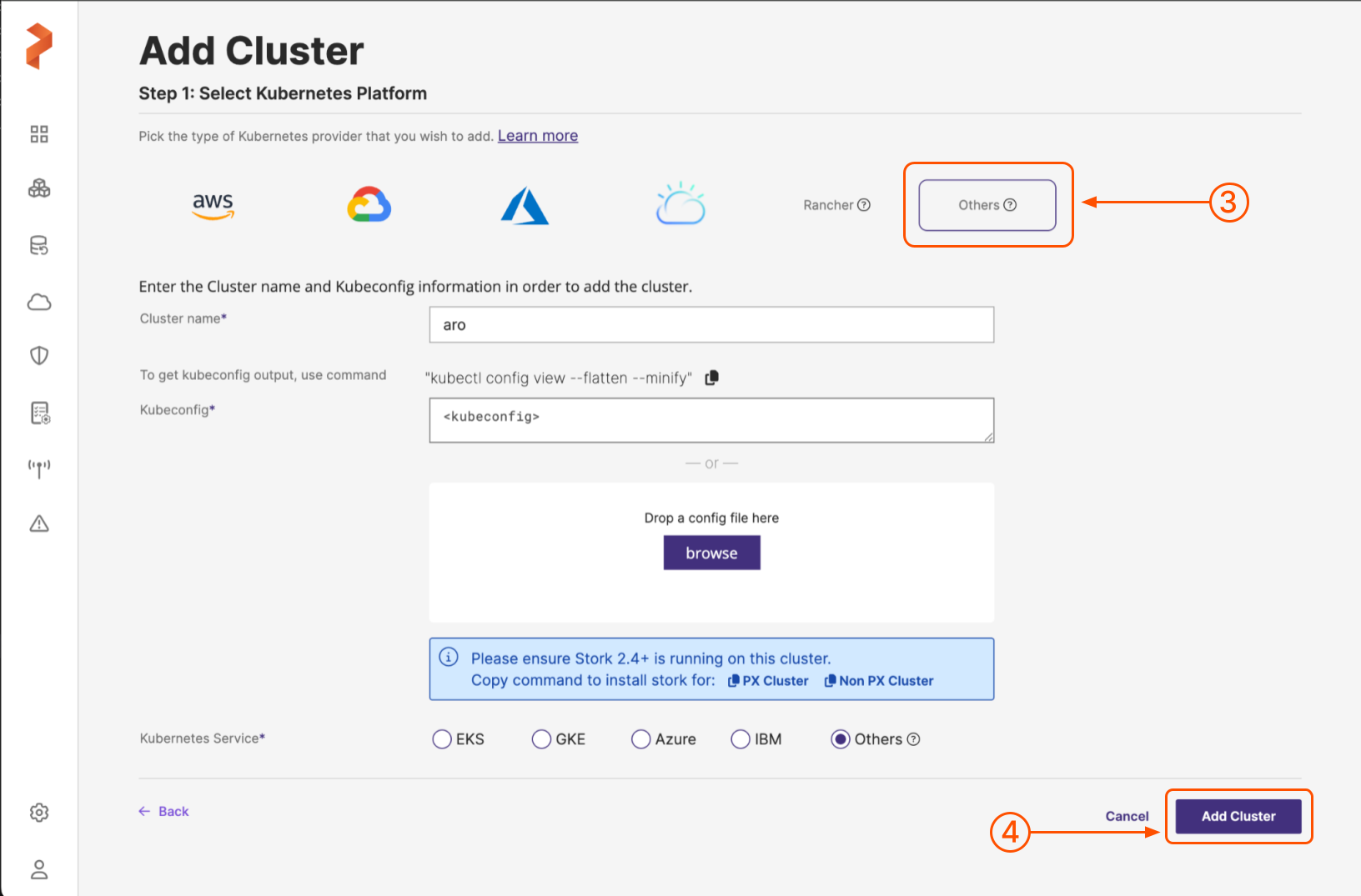 Kubeconfig: retrieve the Kubeconfig from your cluster and paste it in this field or click Browse to upload the config from a file