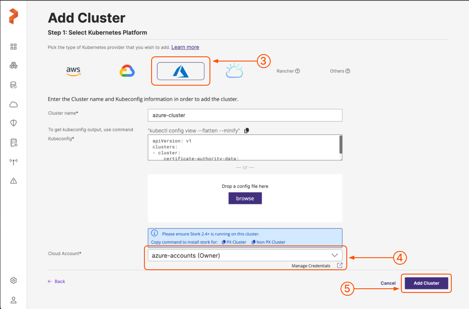 Kubeconfig: retrieve the Kubeconfig from your cluster and paste it here or click Browse to upload it from a file.