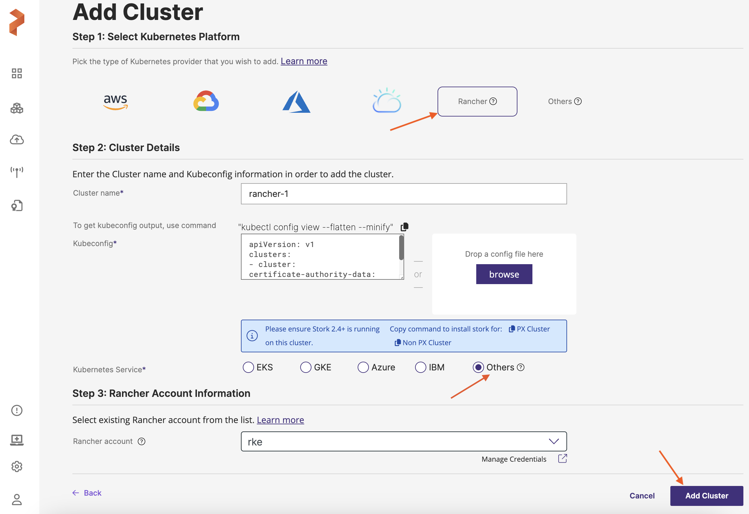 In the Add Cluster page, under Select Kubernetes Platform, click Rancher icon.