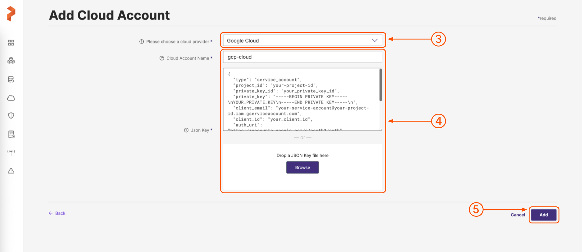 On the Add Cloud Account page, choose a cloud provider: Google Cloud from the drop-down list in the Please choose a cloud provider input field.