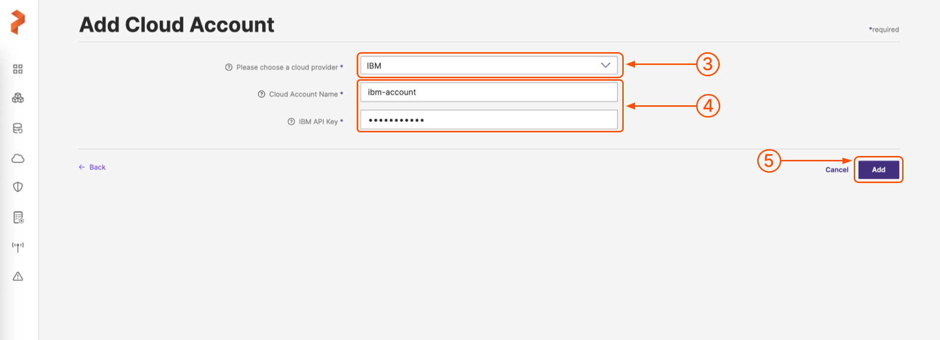 On the Add Cloud Account page, choose a cloud provider: IBM from the drop-down list in the Please choose a cloud provider input field.