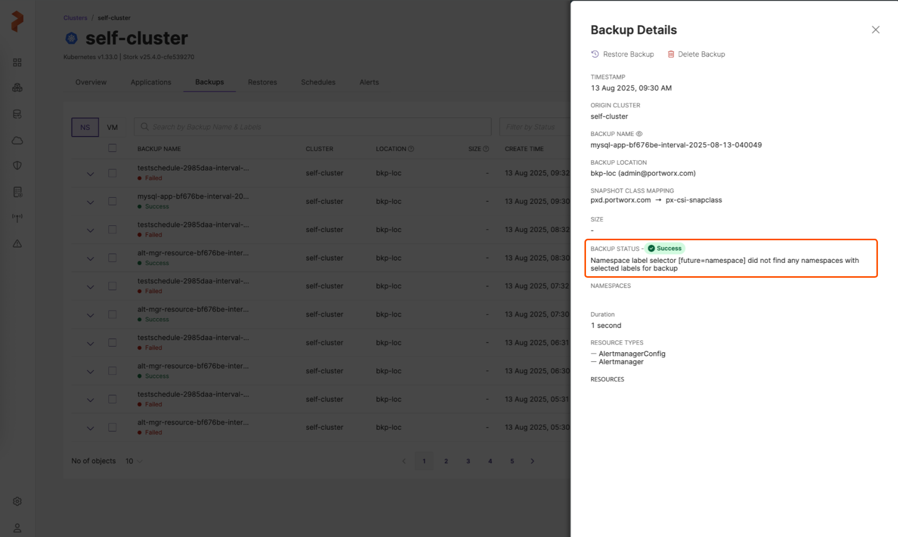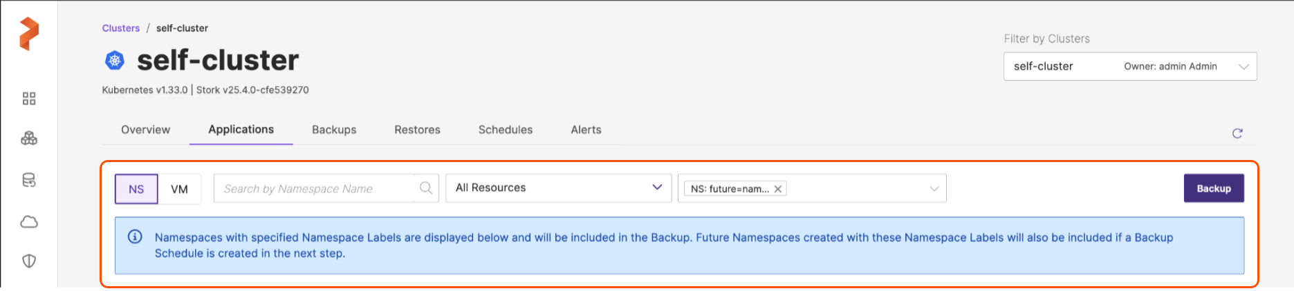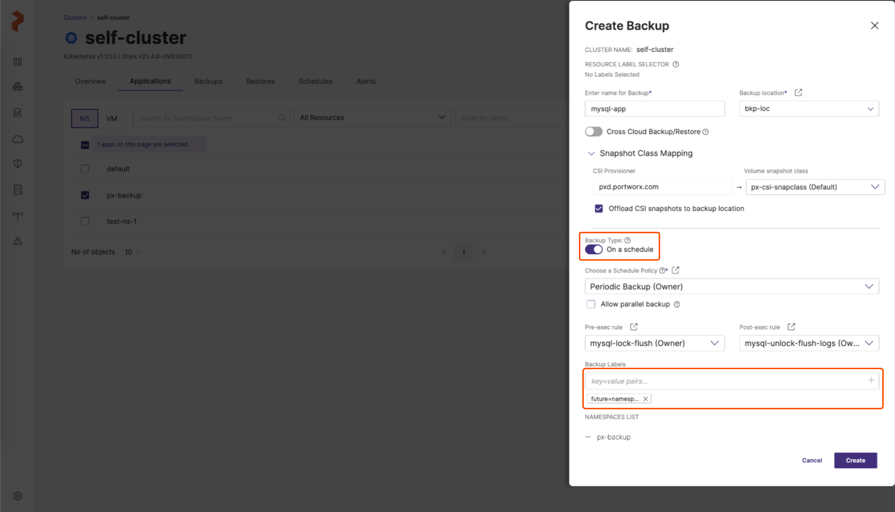 Portworx Backup lists out and auto-selects all the namespaces with the preset labels. For more information on creating a backup with the listed namespaces, refer Create a backup.