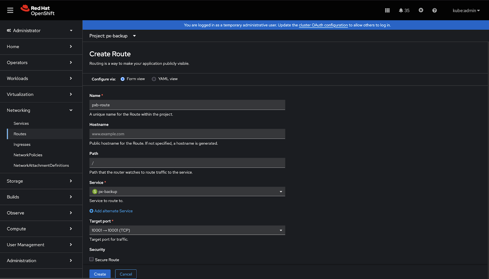 OpenShift clusters have their own monitoring stack so to access the metrics endpoint, you need to create a Route to expose the px-backup service. You might have already created a route to access the Portworx Backup UI, similarly, you can create a route to access the metrics endpoint. See below steps to create a route for the px-backup service: