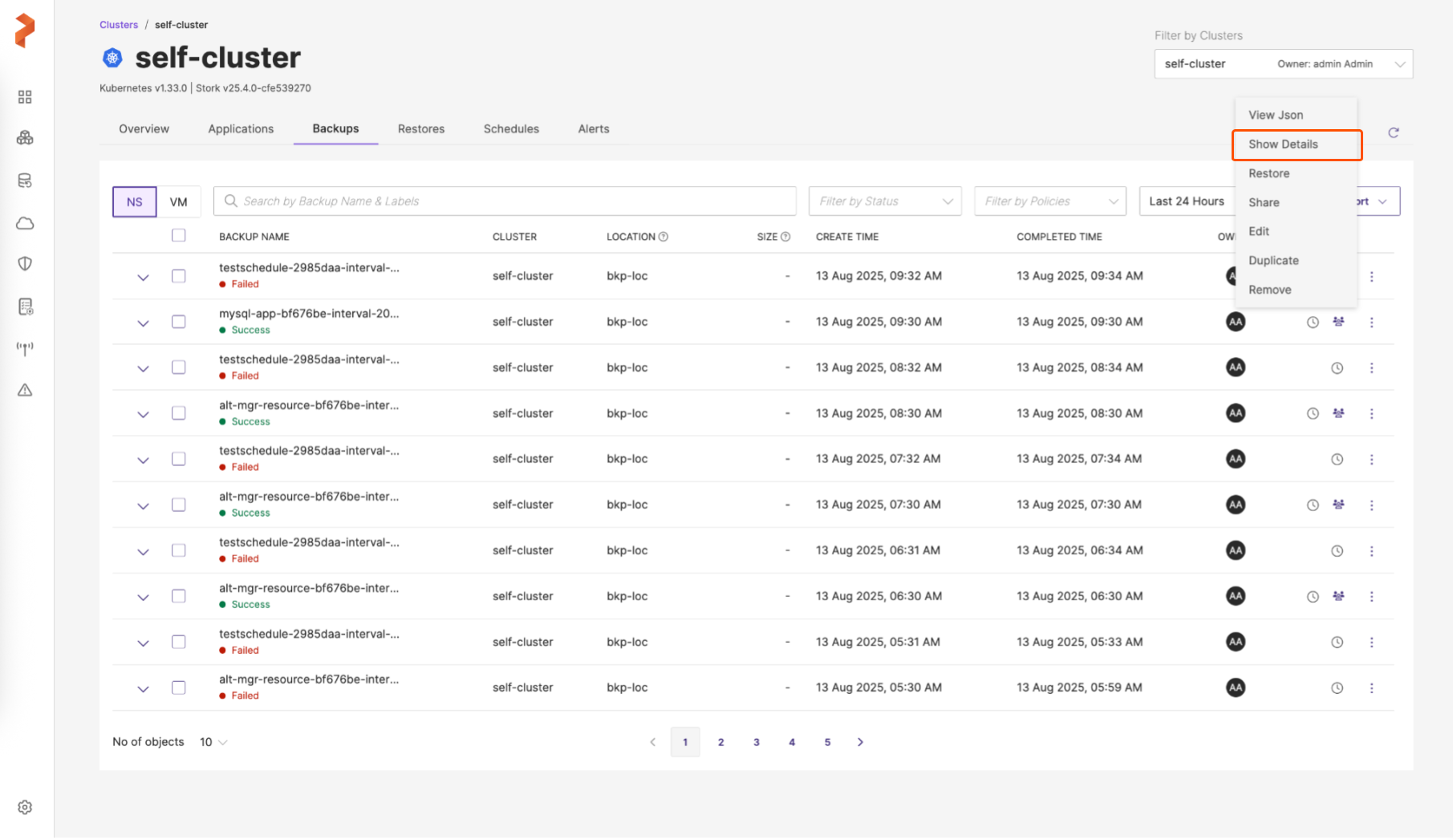 After the backup is created, navigate to the Backups tab of the application cluster, click on the vertical ellipsis of newly created scheduled backup and choose Show details to view the backup details: