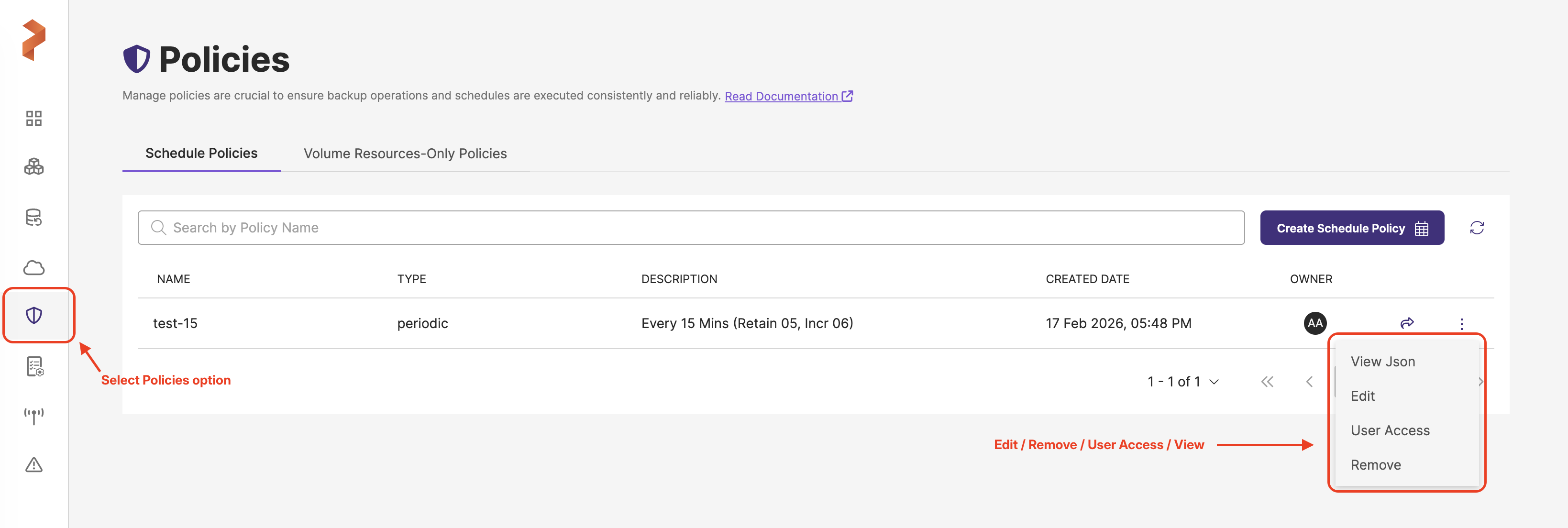 After creating schedule policies, you can modify schedule policies to adjust retention, timing, and other configuration options. To see the available options for schedule policies, click the vertical ellipsis at the end of the schedule policy row and select desired action: