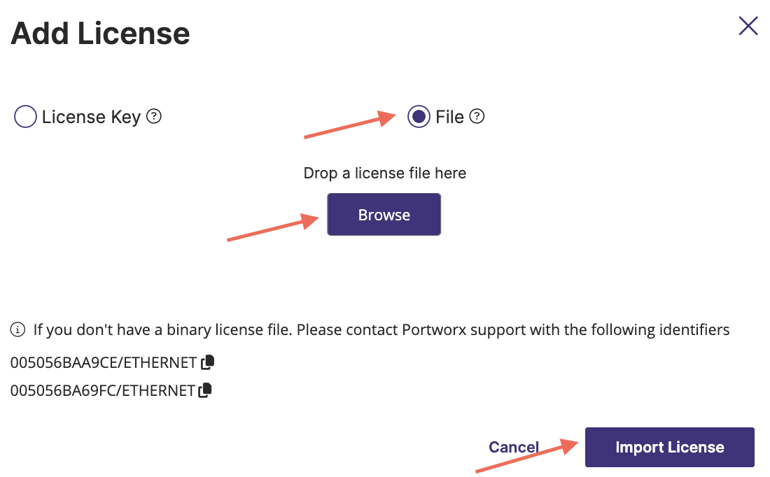 (Optional) To add licenses using a license file, choose File > select the Browse button to upload a file, and click Import License.