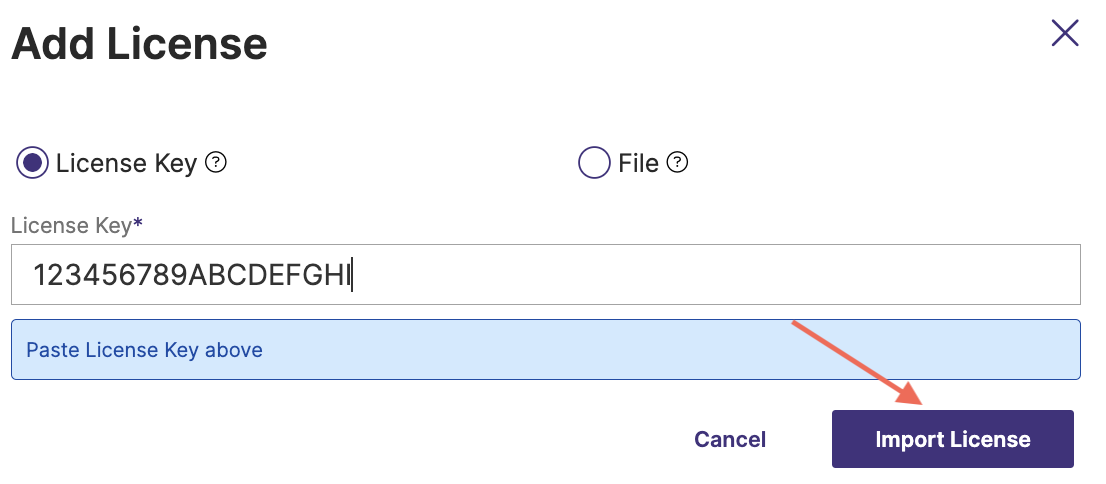 4. Paste your license key into the License Key text field or upload it from a file, and then select the Import License button to add your license: