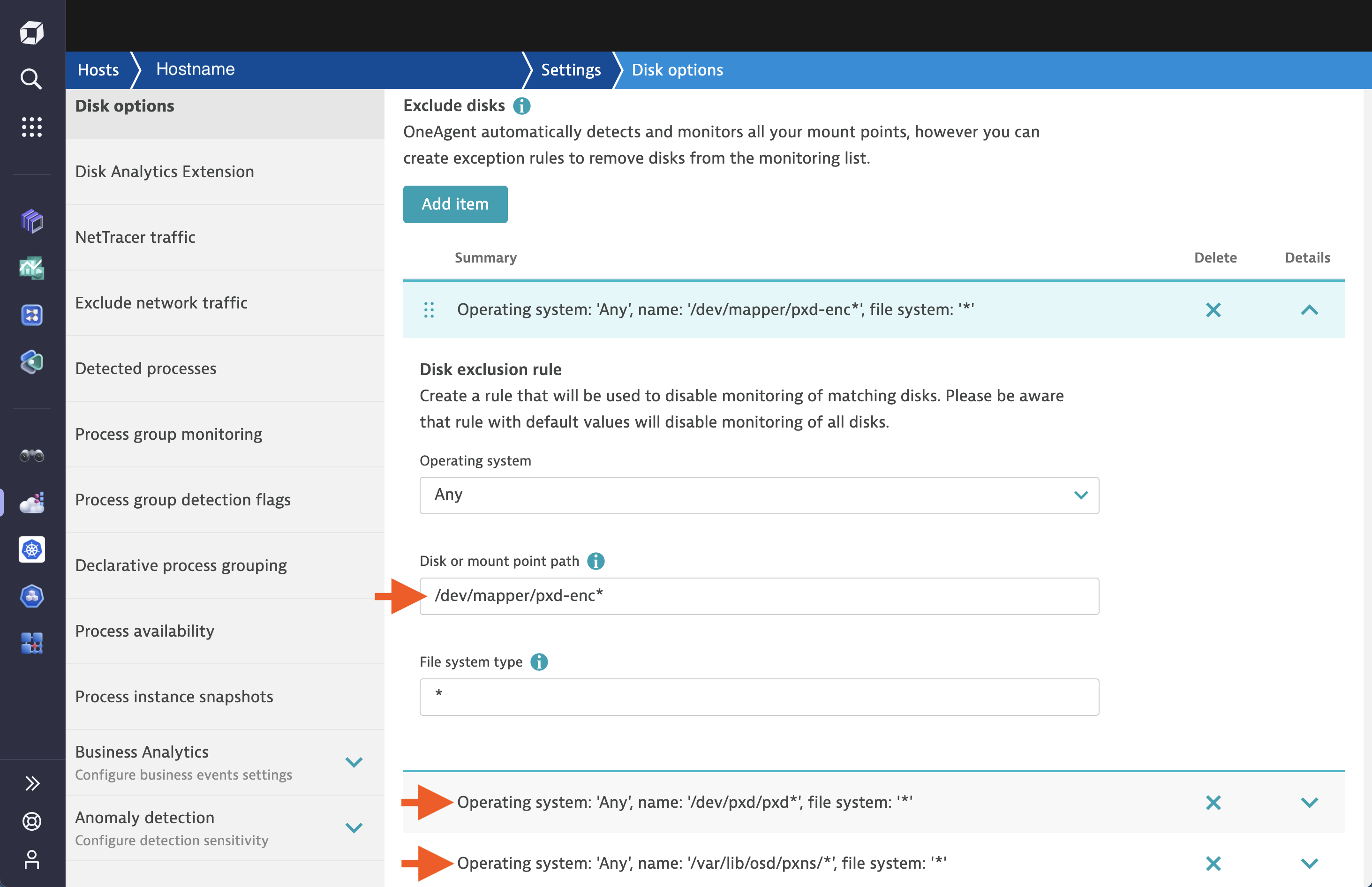 Perform the following steps to create disk exclusion rules to instruct Dynatrace to skip Portworx mount paths and disks: