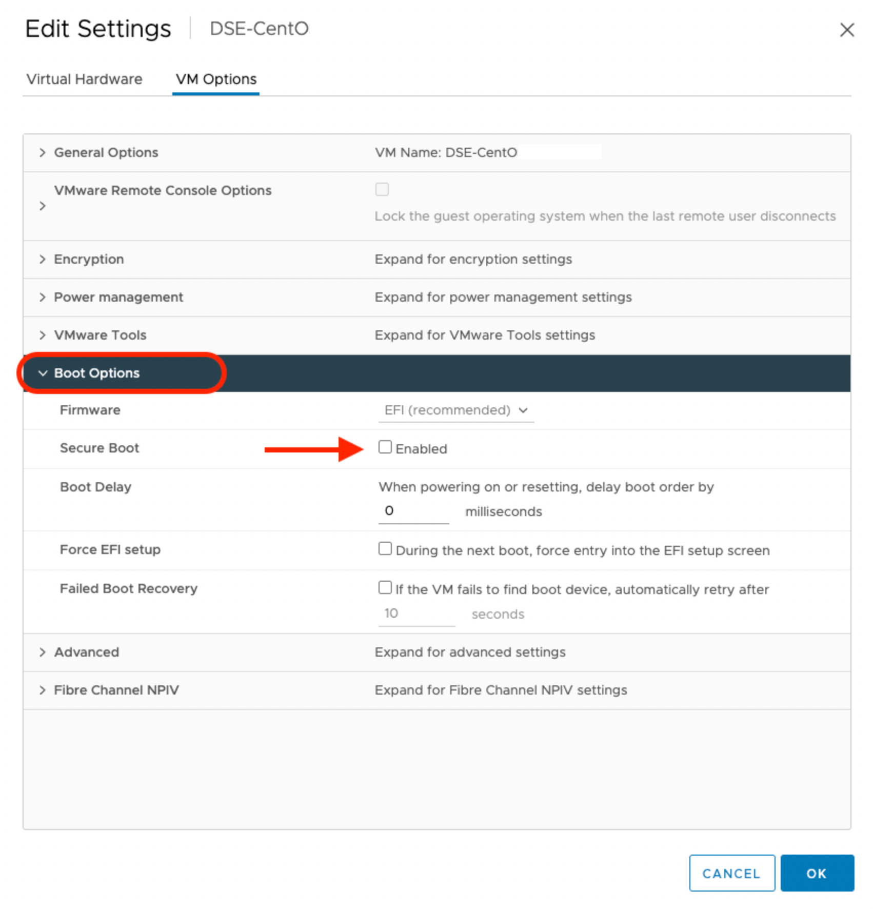 For VMware, navigate to the Edit Setting window of the virtual machine on which you are planning to deploy Portworx Enterprise. Ensure that the checkbox against the Secure Boot option under VM Options is not selected, as shown in the following screenshot: